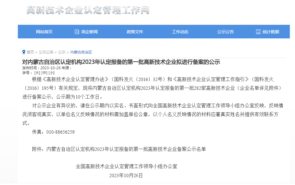 10月26日,根据《高新技术企业认定管理办法》(国科发火〔2016〕32号)和《高新技术企业认定管理工作指引》(国科发火〔2016〕195号)有关规定,对内蒙古自治区认定机构2023年认定的第一批282家高新技术企业进行公示,内蒙古佰惠生新农业科技股份有限公司位列其中。