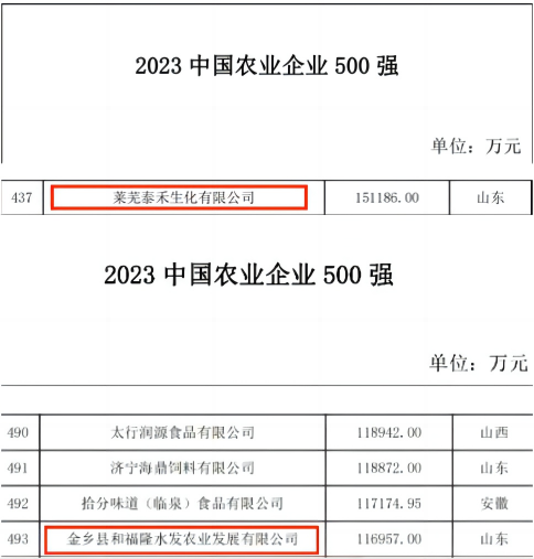12月20日,“2023年中国农业企业500强”榜单正式发布,水发农业集团2家权属公司首次上榜。莱芜泰禾生化有限公司位列第437位,金乡县和福隆水发农业发展有限公司位列第493位。