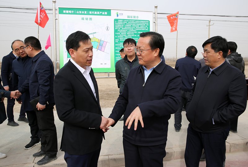 3月14日,新疆维吾尔自治区党委副书记李鹏新一行到新疆喀什(山东水发)现代蔬菜产业园项目现场进行调研。喀什地委书记李宁平、疏勒县委书记董建,疏勒县委副书记、援疆指挥部指挥曹永湖,山东水控发展集团有限公司总经理助理、新疆农业板块负责人刘道营,新疆东鲁水控农业发展有限公司相关负责同志陪同。