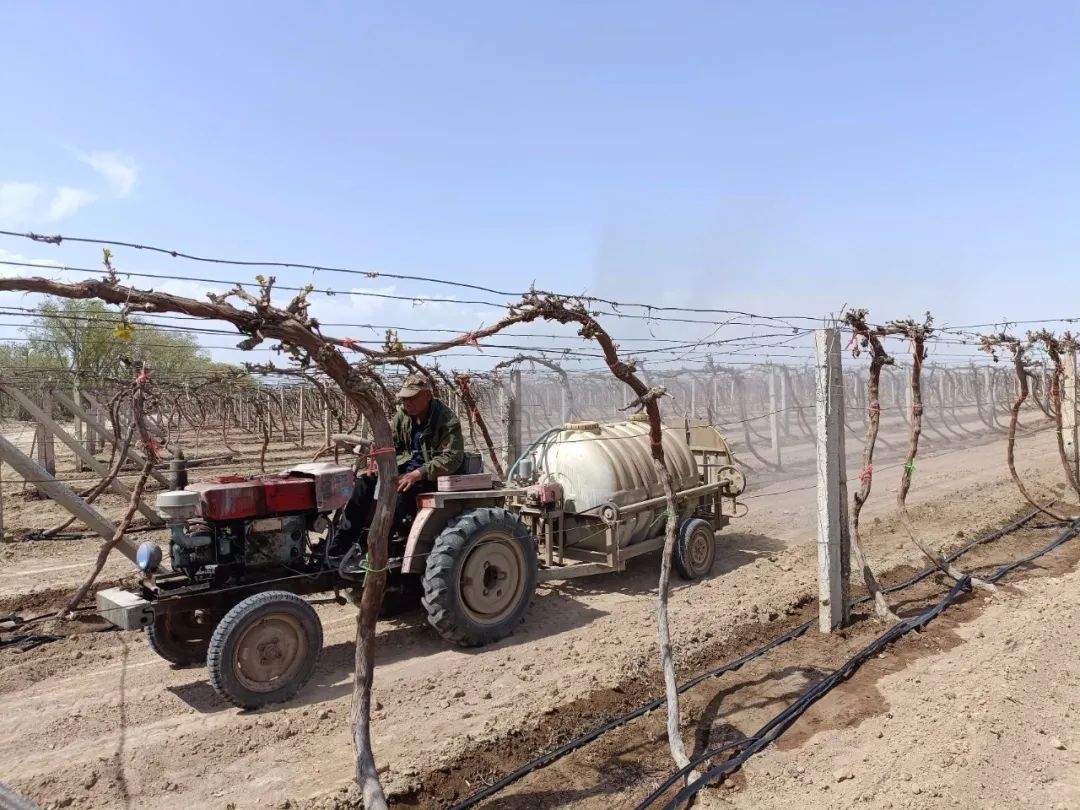 双河水发北疆果蔬公司五师双河市葡萄产业现代农业示范区的技术员仍然战斗在生产一线,为了确保180亩流转葡萄地的苗木出土后的正常生长,按照公司制定绿色葡萄生产标准化管理规程相关要求,公司罗平、何兴华等生产技术人员在调配农药杀菌剂,采用机械化的雾化喷施,对已出土的葡萄苗木开展病虫害集中消杀清理。