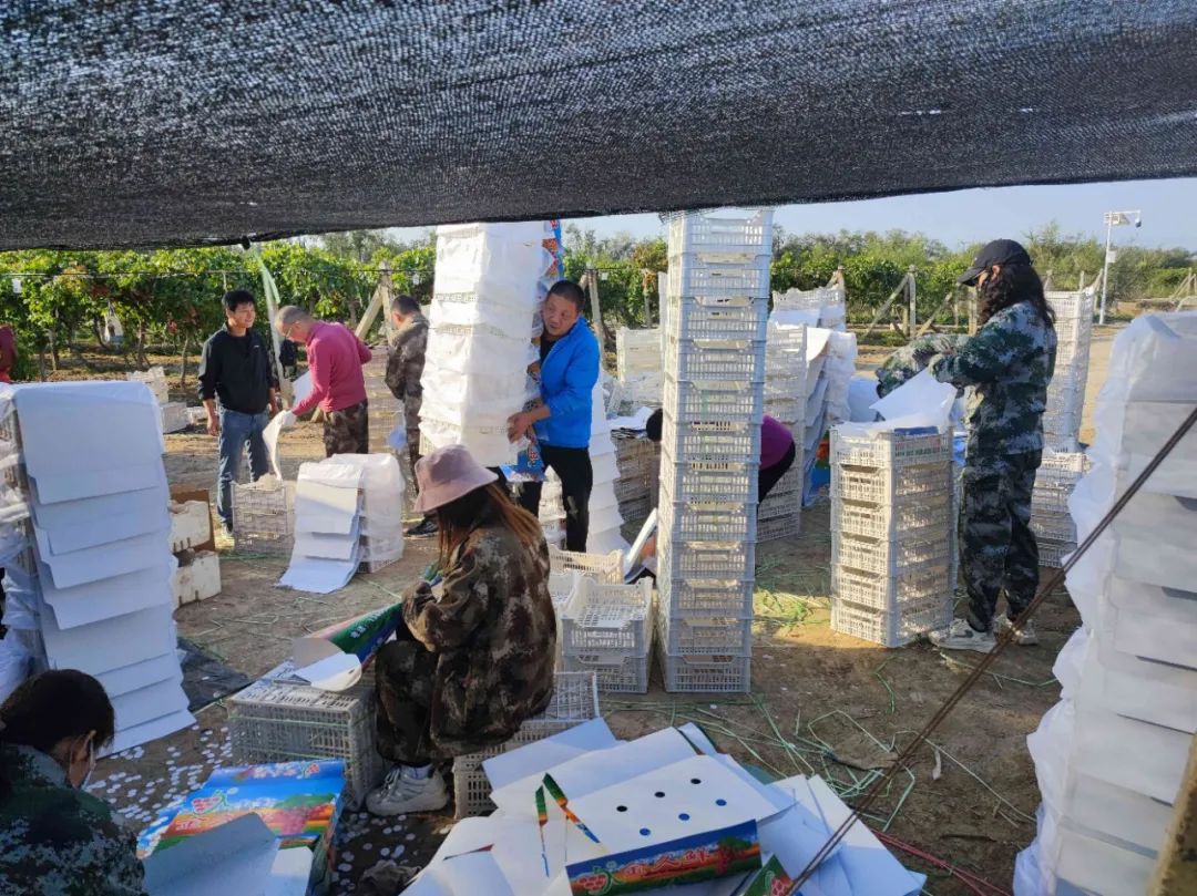 ▲双节期间,双河水发集团权属果蔬公司全体员工在新疆生产建设兵团第五师双河市葡萄基地抢收葡萄。
