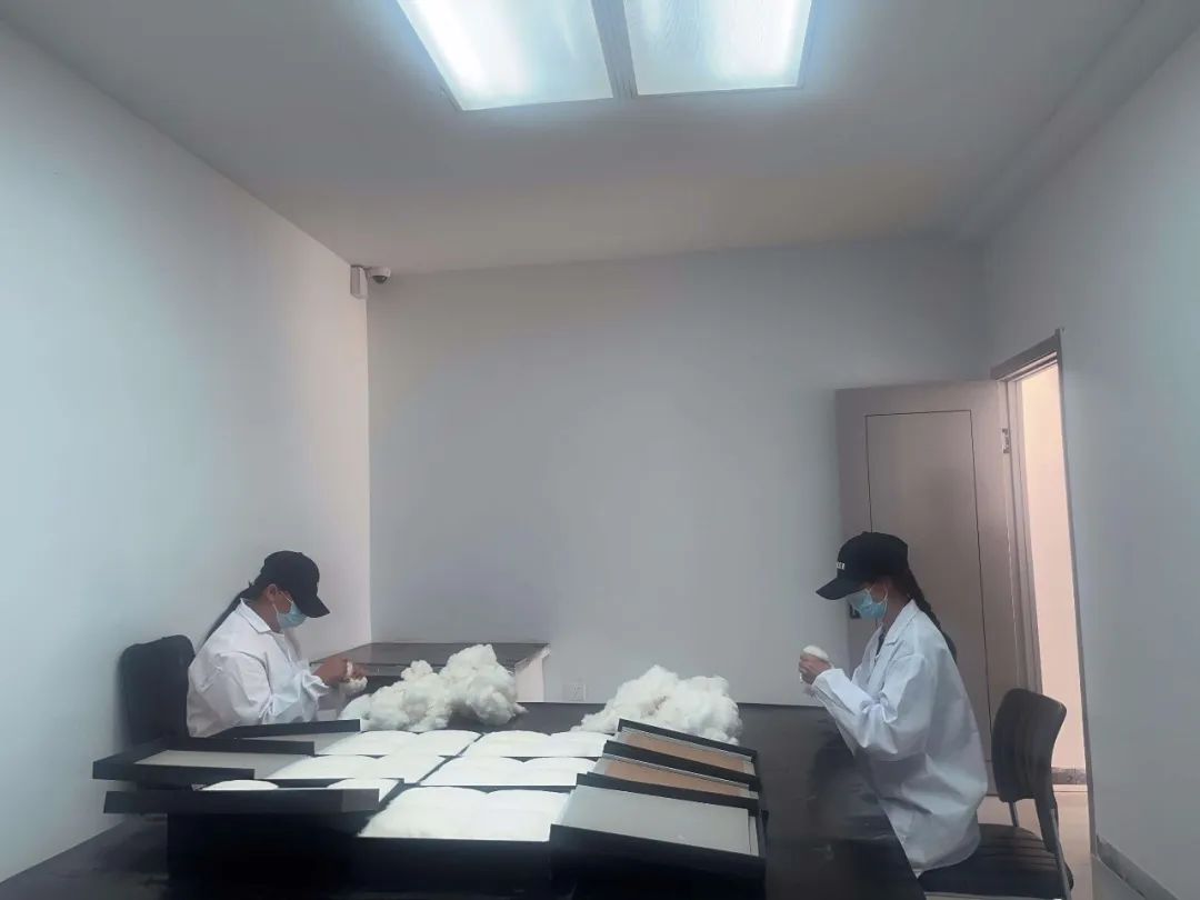 ▲库车水控轧花厂棉检员钟丹、戚娜在岗进行棉检技术练习。