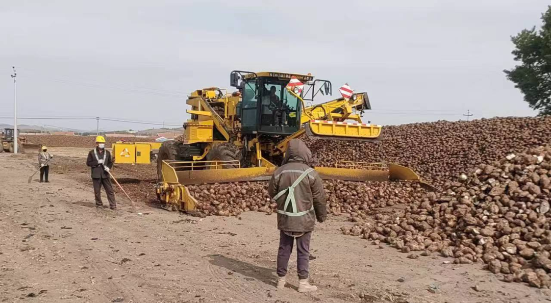 ▲内蒙古佰惠生公司将甜菜从地头拉回公司的堆场后进行堆垛,图中的罗霸机正在进行甜菜的堆垛工作。