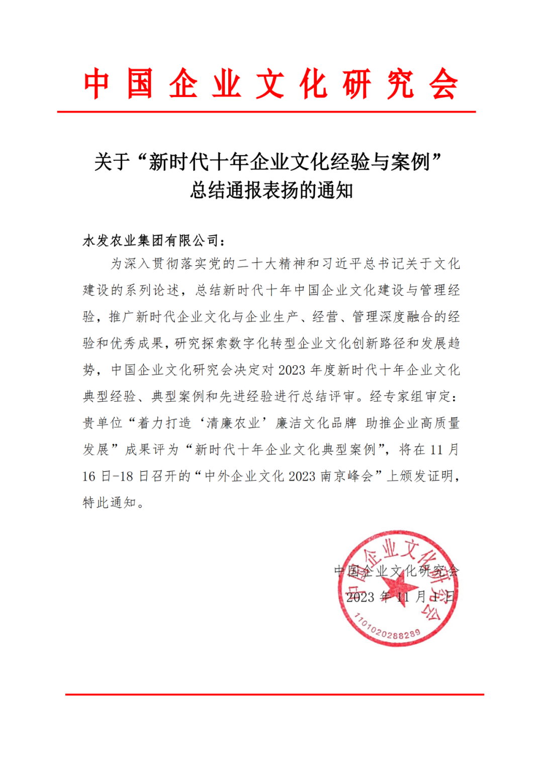 近日,经中国企业文化研究会专家组审定,水发农业集团申报的《着力打造“清廉农业”廉洁文化品牌助推企业高质量发展》成果,被评为“新时代十年企业文化典型案例”并将在即将召开的“中外企业文化2023南京峰会”予以通报表扬。